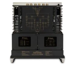 The front panel features new direct LED backlighting for improved appearance and color accuracy. On top, the audio Autoformer and power transformer remain seated just behind the front panel, but are now contained in new glass topped enclosures. Behind them are 2 of our Monogrammed Heatsinks™ which connect to advanced high current output transistors that help eliminate thermal equilibrium lag time. A screening of the amplifier’s block diagram has been added to the panel located between the heatsinks.