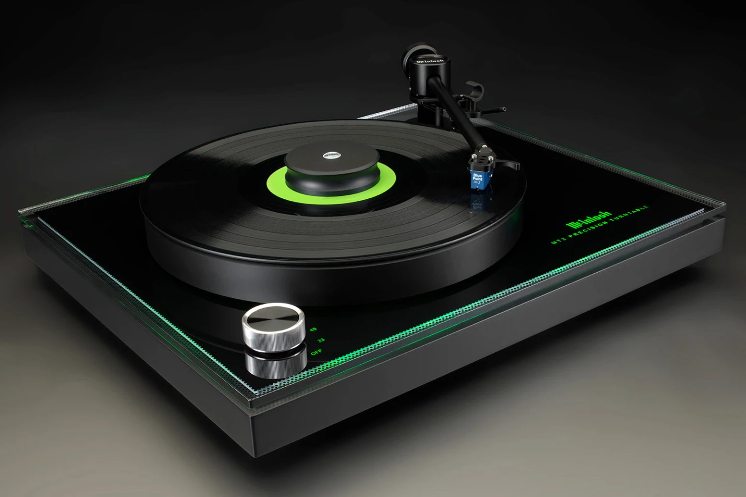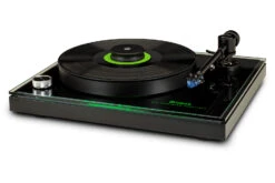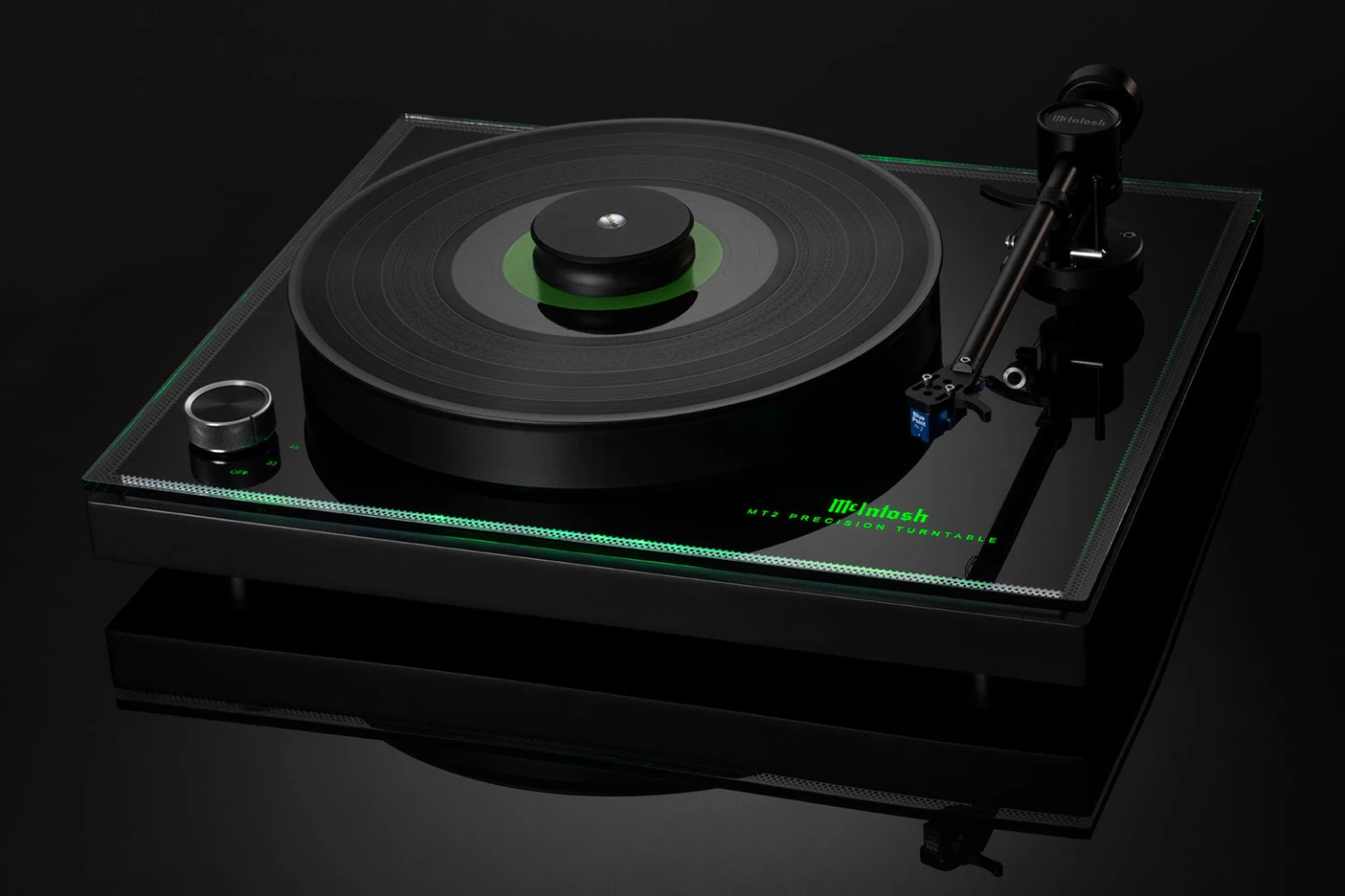 The McIntosh MT2 Precision Turntable combines the latest in turntable technology and design to deliver both superb performance and accurate playback. The MT2 is a great way to upgrade your home audio system to play vinyl albums. A full complement of features allows for all recordings to be reproduced with flawless realism. Its advanced electronic and mechanical design will give you many years of smooth, trouble-free operation. A subtle green glow emanates from under the platter and the outside edges of the plinth for a touch of refined ambiance.