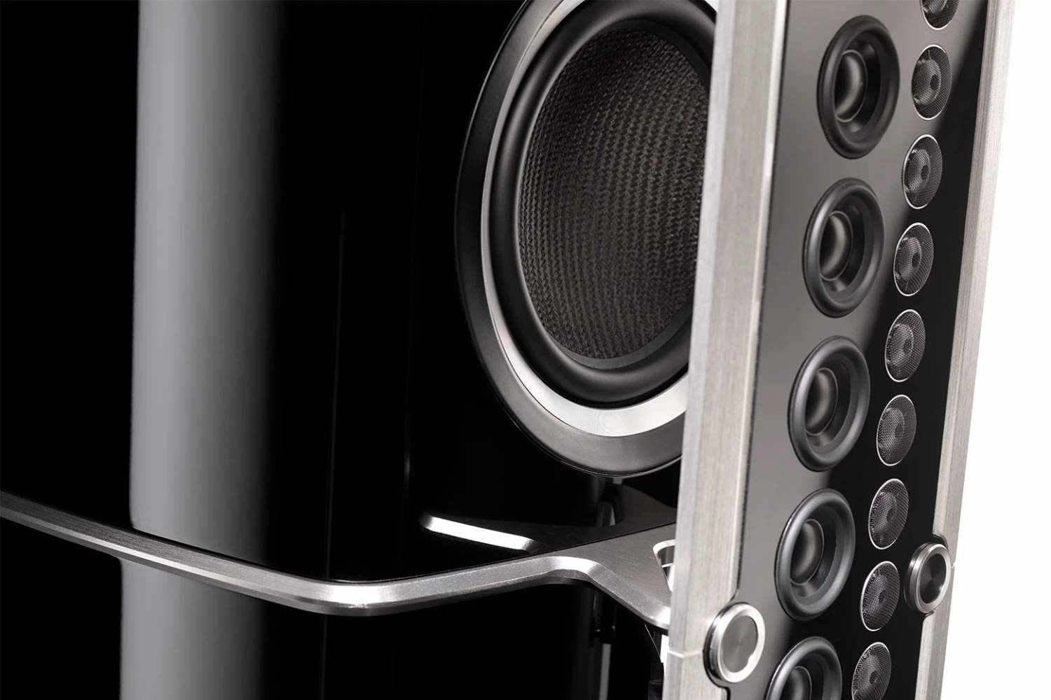A 4-way speaker, the XRT2.1K produces excellent sound quality at all levels of the human audio spectrum. The unique left and right speaker each use a total of 81 drivers consisting of (6) 8” woofers, (2) 6.5” low frequency midranges, (28) 2” upper frequency midranges and (45) ¾” tweeters, to deliver a nearly unparalleled sound reproduction. The woofer and low frequency midrange drivers, housed in the large bass enclosure cabinet, are brand new designs that were specifically created for the XRT2.1K. Their extremely stiff yet lightweight diaphragms combined with a very long throw design ensures amazing extension on low frequencies. Located on the line array are the Aluminum–Magnesium upper frequency midrange and tweeter metal drivers, which have been specially customized for the XRT2.1K and feature neodymium magnets.