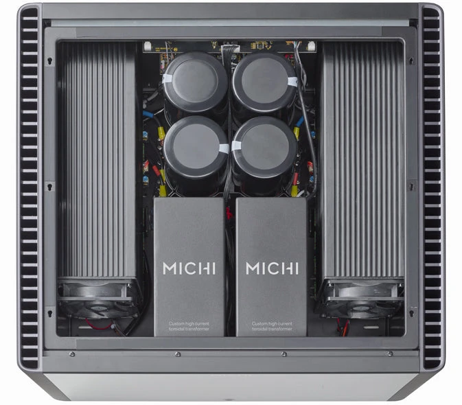 The stunning control and authoritative power of the Michi M8 Monoblock Amplifier is the result of a perfect balance of science meets art delivering 1,080 watts of Class AB power into 8 ohms and an astounding 1,800 watts to the most demanding 4 ohm loudspeakers. The M8 is powered by a pair of custom engineered, low noise, in-house manufactured toroidal transformers supported by 4 British patented slit foil, high efficiency, low ESR bulk storage capacitors for impactful bass with exceptional control under extreme loading conditions.